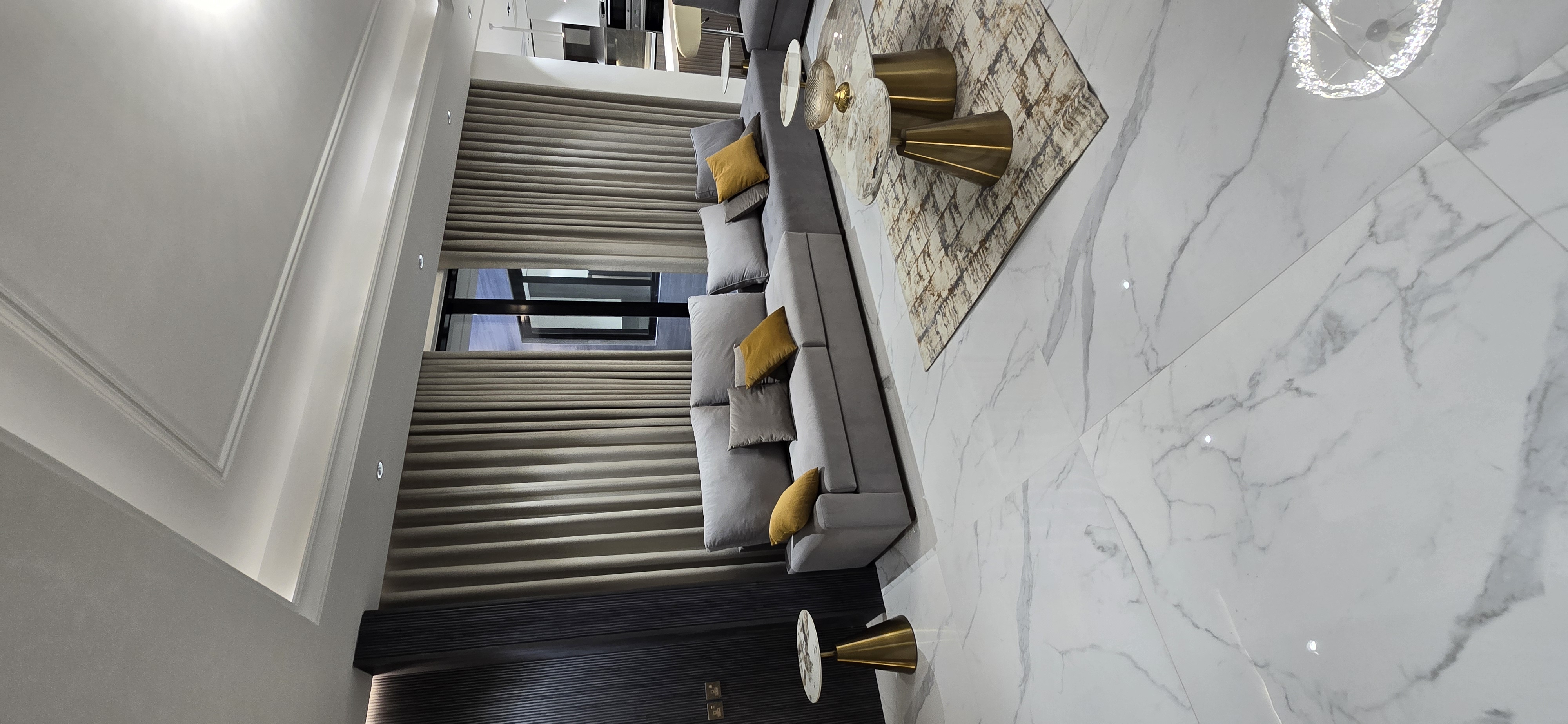 Full Furnishing: We sourced and installed luxury furniture sets and majlis seating, meticulously coordinated with the marble and wood elements for a harmonious aesthetic.